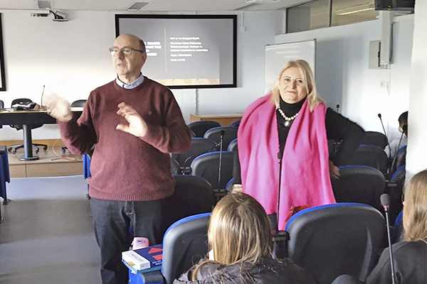 Ο Κοσμήτορας της Σχολής Οικονομικών και Πολιτικών Επιστημών ΑΠΘ, κ. Γρηγόρης Ζαρωτιάδης, καλωσόρισε τα παιδιά, τους μίλησε για τη Σχολή και συνεχάρη τους συνοδούς εκπαιδευτικούς και τα παιδιά για τη συγκεκριμένη δράση.