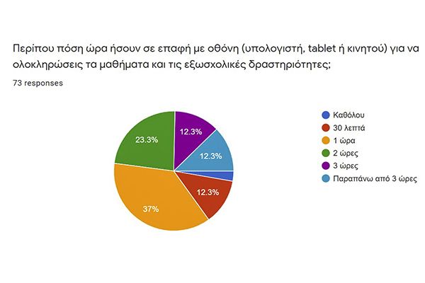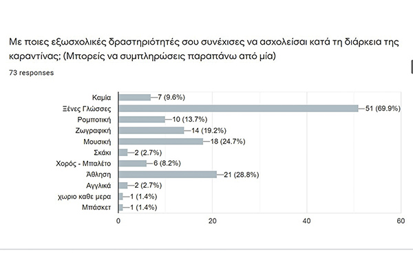Μεγάλο ρόλο κατά τη διάρκεια της καραντίνας έπαιξαν οι ηλεκτρονικές συσκευές (Η/Υ, tablet ή κινητό). Η πλειοψηφία των μαθητών τις χρησιμοποιούσε περίπου δύο ώρες καθημερινά για την ολοκλήρωση των σχολικών και εξωσχολικών μαθημάτων. Παράλληλα υπήρχαν και δραστηριότητες που δεν απαιτούσαν τη χρήση οθόνης, αλλά αυτές διαρκούσαν λιγότερο (30΄έως 1 ώρα).