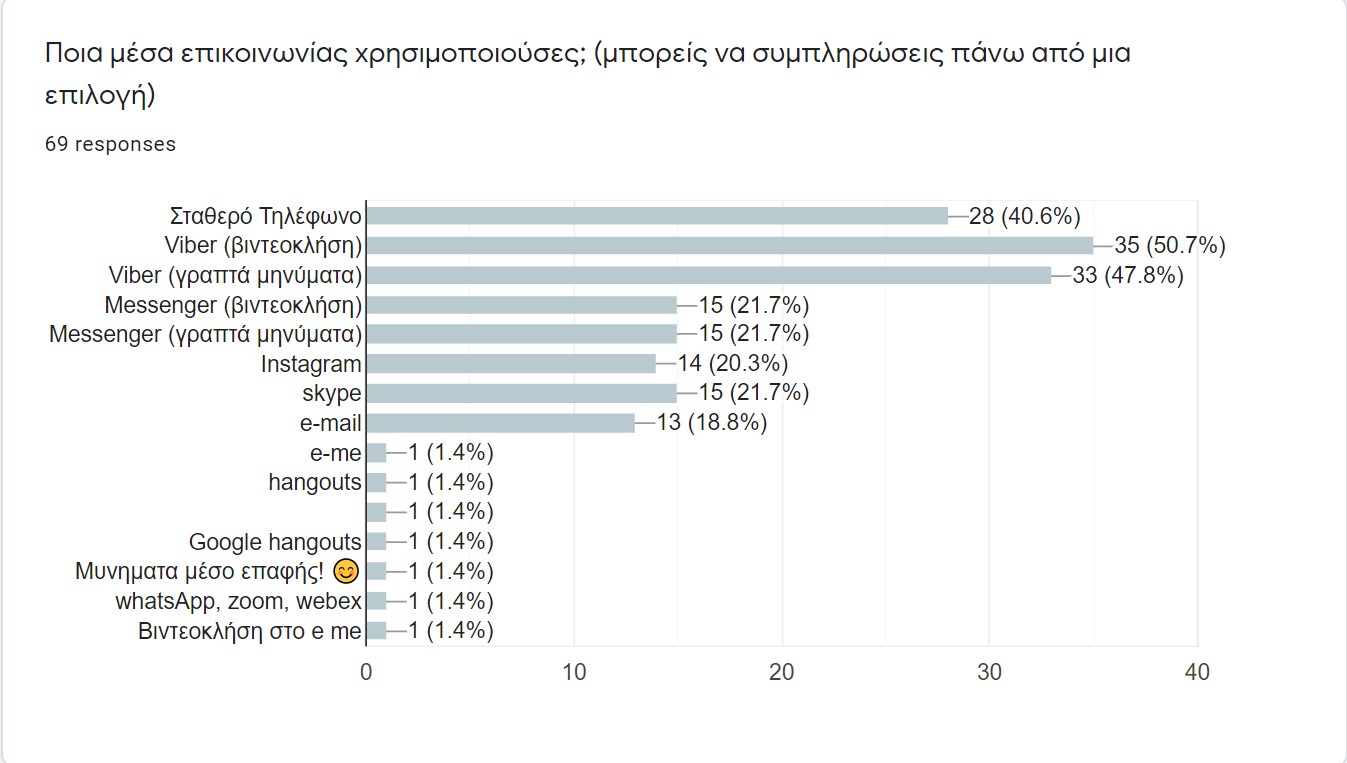 Επικοινωνία – Φιλικές σχέσεις: Οι περισσότεροι επικοινωνούσαν με τους φίλους τους μίση με μία ώρα καθημερινά. Ως μέσω επικοινωνίας χρησιμοποιούσαν την εφαρμογή viber για βιντεοκλήσεις, και για γραπτά μηνύματα, ενώ σε μεγάλο βαθμό χρησιμοποιήθηκαν και τα σταθερά τηλέφωνα. Η συχνή επικοινωνία είχε σαν αποτέλεσμα οι μαθητές να δηλώσουν ότι οι φιλικές τους σχέσεις άλλαξαν ελάχιστα κατά τη διάρκεια της καραντίνας.
