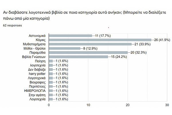 Κατασκευάστηκε ένα ερωτηματολόγιο, στο πλαίσιο του μαθήματος της Κοινωνικής και Πολιτικής Αγωγής, το οποίο, αφού δοκιμάστηκε πρώτα στα παιδιά του τμήματος, στάλθηκε και συμπληρώθηκε ηλεκτρονικά από τα παιδιά των μεγάλων τάξεων, Δ΄, Ε΄ και Στ΄. Στην έρευνα συμμετείχαν 70 μαθητές και μαθήτριες. Ακολούθησε ή επεξεργασία των δεδομένων στην τάξη και προέκυψαν τα ακόλουθα συμπεράσματα τα οποία χωρίζονται σε πέντε κατηγορίες.