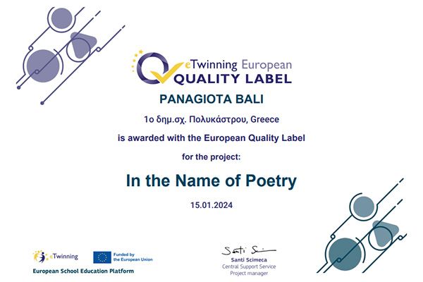 Μετά από την απόκτηση εθνικής ετικέτας ποιότητας το 1ο Δημοτικό Σχολείο Πολυκάστρου έλαβε και την ευρωπαϊκή ετικέτα ποιότητας e-Twinning για το συνεργατικό έργο IntheNameofPoetry το οποίο πραγματοποιήθηκε κατά τη σχολική χρονιά 2022-23 καθώς συγκέντρωσε υψηλή βαθμολογία με βάση συγκεκριμένα εκπαιδευτικά κριτήρια.