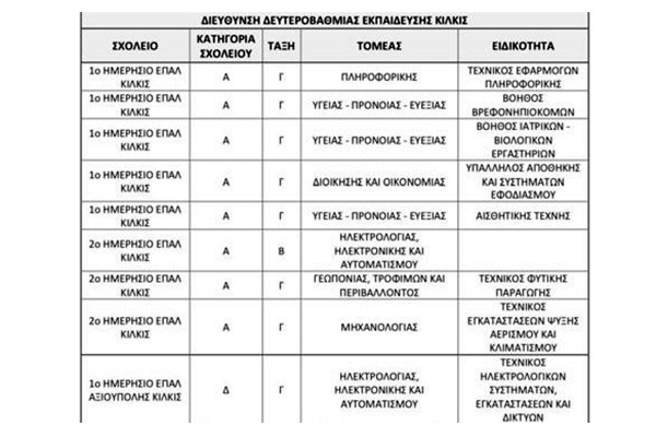 Ειδικότερα εγκρίθηκαν 8 τμήματα σε ΓΕΛ και 9 σε ΕΠΑΛ. Όσον αφορά τα ΓΕΛ, ένα εκ των τμημάτων που εγκρίθηκαν είναι στο ΓΕΛ Γουμένισσας, 3 στο ΓΕΛ Καμπάνη και 4 στο ΓΕΛ Χέρσου. Όσον αφορά τα ΕΠΑΛ, 5 αφορούν το 1ο Ημερήσιο ΕΠΑΛ Κιλκίς, 3 το 2ο Ημερήσιο ΕΠΑΛ Κιλκίς και 1 το 1ο Ημερήσιο ΕΠΑΛ Αξιούπολης.