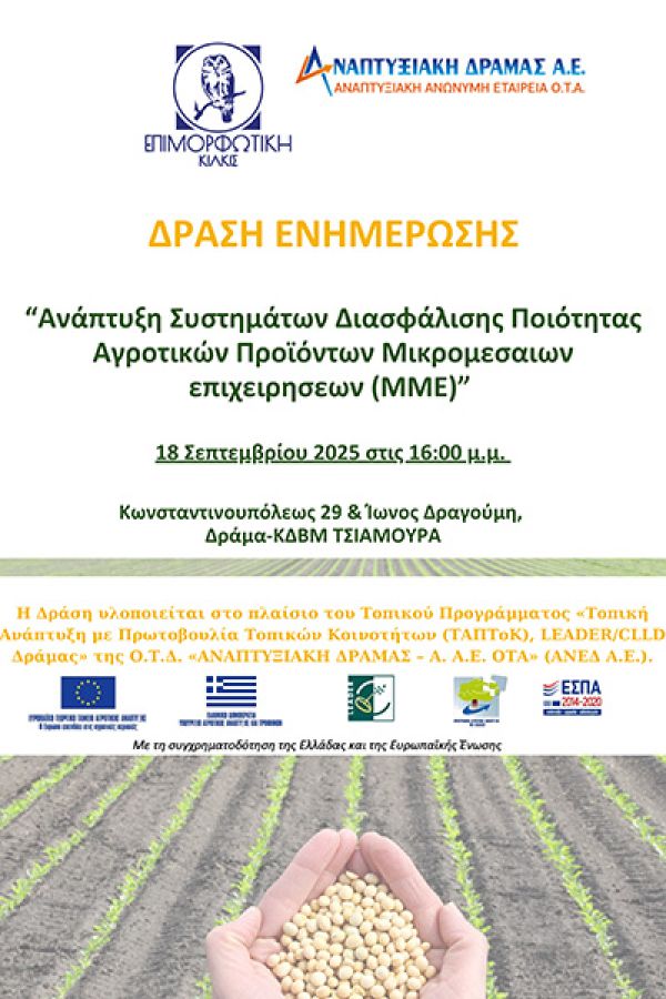 Η Δράση Ενημέρωσης πραγματοποιείται στο πλαίσιο της Πράξης «Συστήματα Διασφάλισης Ποιότητας Τροφίμων και Αγροτικών Προϊόντων σε ΜΜΕ» η οποία εντάχθηκε στο ΠΑΑ 2014-2020, στην Υποδράση 19.2.1.2 «Μεταφορά γνώσεων & ενημέρωσης σε ΜΜΕ αγροτικών περιοχών» στο πλαίσιο του Τοπικού Προγράμματος «Τοπική Ανάπτυξη με Πρωτοβουλία Τοπικών Κοινοτήτων (ΤΑΠΤοΚ), LEADER/CLLD Δράμας» της Ο.Τ.Δ. «ΑΝΑΠΤΥΞΙΑΚΗ ΔΡΑΜΑΣ – Α. Α.Ε. ΟΤΑ» (ΑΝΕΔ Α.Ε.). Η ΑΝΕΔ συμβάλει διαρκώς και αποτελεσματικά στην τοπική αειφόρο ανάπτυξη του νομού Δράμας, διεκδικώντας προγράμματα αγροτικής ανάπτυξης όπως είναι το Leader. Τα προγράμματα αυτά προσφέρουν πέρα από τη γνώση και οικονομικές ενισχύσεις σε συγκεκριμένη ομάδα-στόχο κάθε φορά (ανάλογα με την εκάστοτε Πράξη).