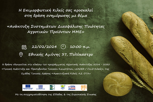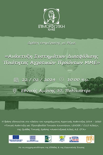 Η Δράση Ενημέρωσης πραγματοποιείται στο πλαίσιο της Πράξης «Συστήματα Διασφάλισης Ποιότητας Τροφίμων και Αγροτικών Προϊόντων σε ΜΜΕ της Περιφερειακής Ενότητας Κιλκίς» η οποία εντάχθηκε στο ΠΑΑ 2014- 2020, στην Υποδράση 19.2.1.2 «Μεταφορά γνώσεων & ενημέρωσης σε ΜΜΕ αγροτικών περιοχών» στο πλαίσιο του Τοπικού Προγράμματος «Τοπική Ανάπτυξη με Πρωτοβουλία Τοπικών Κοινοτήτων (ΤΑΠΤοΚ), LEADER/CLLD Κιλκίς» της Ο.Τ.Δ. «ΑΝΑΠΤΥΞΙΑΚΗ ΚΙΛΚΙΣ – Α. Α.Ε. ΟΤΑ» (ΑΝ.ΚΙ. Α.Ε.). Η ΑΝ.ΚΙ συμβάλει διαρκώς και αποτελεσματικά στην τοπική αειφόρο ανάπτυξη του νομού Κιλκίς, διεκδικώντας προγράμματα αγροτικής ανάπτυξης όπως είναι το Leader. Τα προγράμματα αυτά προσφέρουν πέρα από τη γνώση και οικονομικές ενισχύσεις σε συγκεκριμένη ομάδα-στόχο κάθε φορά (ανάλογα με την εκάστοτε Πράξη).