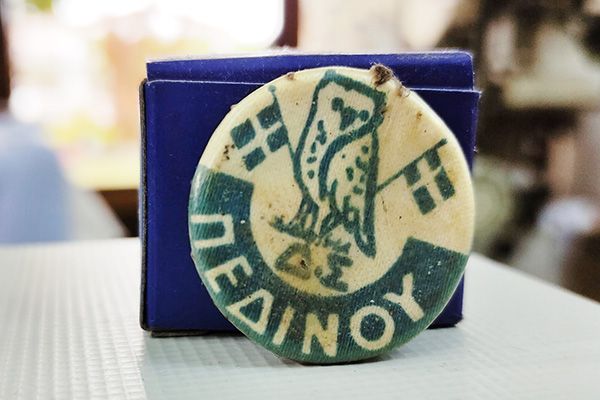«1968. Το σήμα αυτό (φωτογραφία) στόλιζε την μπλε ποδιά με τον άσπρο χειροποίητο γιακά από τα χεράκια της γιαγιάς που φορούσαμε στο σχολείο.