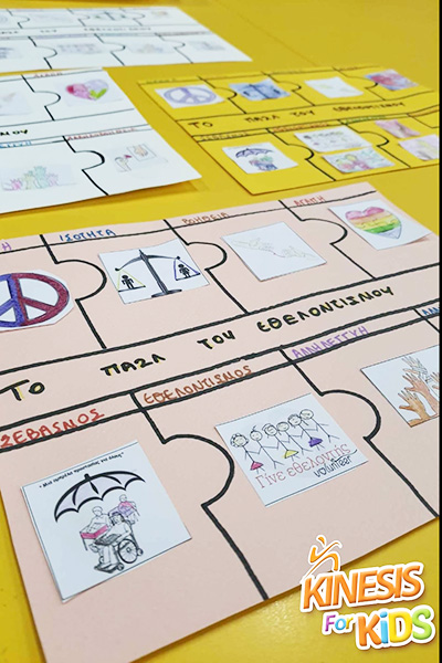 Άλλη μία κατασκευή ολοκληρώθηκε την ώρα των Εικαστικών όπου φτιάξαμε μια κατασκευή αφιερωμένη στην αξία του Εθελοντισού. Οι μικροί μας φίλοι εργάστηκαν ομαδικά και σχεδίασαν την κατασκευή τους· έκοψαν διάφορα κομμάτια και τα κόλλησαν.