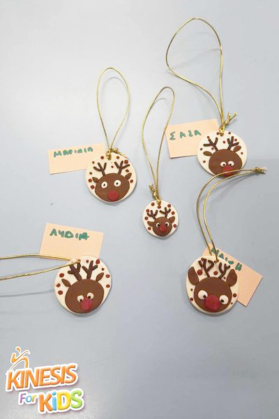Το πρώτο μας χριστουγεννιάτικο στολίδι έκανε την εμφάνισή του στο ΚΔΑΠ Kinesis στο αγαπημένο μας μάθημα πολυμερικού πηλού. Το στολιδάκι μας σε σχήμα μπάλας είχε σαν σχέδιο έναν χειροποίητο Ρούντολφ. Αφού ψήθηκε, περάσαμε χρυσαφιά κορδέλα και αμέσως φύγαμε για να το διακοσμήσουμε στο δέντρο μας.