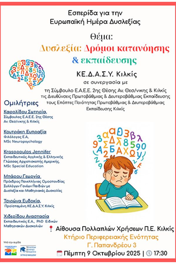 Το ΚΕ.Δ.Α.Σ.Υ. Κιλκίς σε συνεργασία με τη Σύμβουλο Ε.Α.Ε.Ε. 2ης Θέσης Αν. Θεσ/νίκης & Κιλκίς, τις Διευθύνσεις Πρωτοβάθμιας & Δευτεροβάθμιας Εκπαίδευσης, τους Επόπτες Ποιότητας Πρωτοβάθμιας & Δευτεροβάθμιας Εκπαίδευσης Κιλκίς, διοργανώνουν επιμορφωτική εσπερίδα με αφορμή την Ευρωπαϊκή Ημέρα Δυσλεξίας, με τίτλο: «Δυσλεξία: Δρόμοι Εκπαίδευσης & Κατανόησης».