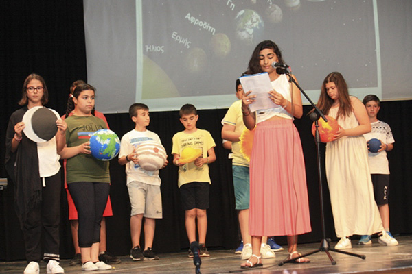 Με αφορμή τα 50 χρόνια από την Προσελήνωση του Ανθρώπου, παρουσιάστηκε ένα δρώμενο με τους πρώτους αστροναύτες στη Σελήνη. Στη συνέχεια, η μαθήτρια Βασιλική Δεβετζή έκανε την εισαγωγή στο θεατρικό «Οι πλανήτες και το ηλιακό μας σύστημα»τραγουδώντας υπέροχα «Το τραγούδι των Πλανητών» με τη συνοδεία του Φάνη Μπουφίδη στο αρμόνιο. Αξίζει να σημειωθεί ότι τα παιδιά μελέτησαν το τραγούδι στο διαδίκτυο και το προσάρμοσαν οι ίδιοι! Το δεύτερο δρώμενο ήταν «Η Ενέργεια». Οι εκπαιδευτικοί Κατερίνα Μπόσκου, Αφροδίτη Ντίνου και Νίκη Παυλίδου συνεργάστηκαν για την ΣΤ’.
