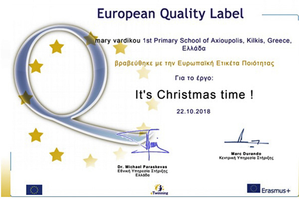 Το έργο των μαθητών και μαθητριών, της συντονίστριας καθηγήτριας Αγγλικών κ. Βαρδίκου Μαρίας και του σχολείου έχει αναγνωριστεί στο υψηλότερο Ευρωπαϊκό επίπεδο, ενώ τα κριτήρια με βάση τα οποία αξιολογήθηκε ήταν η συνεργασία και η αλληλεπίδραση των συνεργαζόμενων σχολείων, σε όλες τις φάσεις του έργου, σε επίπεδο εκπαιδευτικών και μαθητών, με σκοπό τη δημιουργία ενός εύχρηστου βιβλίου με παραδοσιακές Χριστουγεννιάτικες συνταγές από τις συνεργαζόμενες χώρες.
