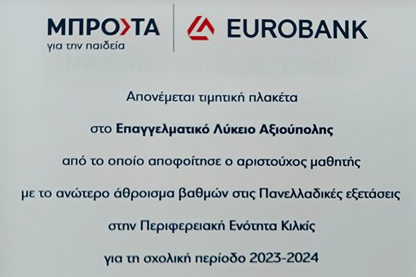 ο οποίος εισήχθη στην Τριτοβάθμια Εκπαίδευση Πρώτος των Πρώτων Αριστούχων όλων των ΕΠΑ.Λ και ΓΕΛ του νομού Κιλκίς και 3ος μεταξύ όλων των Λυκείων της Περιφέρειας Κεντρικής Μακεδονίας. Ο Χρήστος Ματσούκας αλλά και το 1ο Ημερήσιο ΕΠΑ.Λ Αξιούπολης βραβεύθηκαν από την Τράπεζα EUROBANK την Πέμπτη 23/1/2025 στο Βελλίδειο Συνεδριακό Κέντρο Θεσσαλονίκης.
