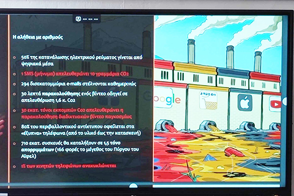 Η ευρεία χρήση του διαδικτύου, των εργαλείων που προσφέρει και των ηλεκτρονικών συσκευών απειλούν το περιβάλλον εξίσου με τις παραδοσιακές μορφές ενέργειας! Οι μαθητές και οι μαθήτριές μας θα αναλάβουν στο άμεσο μέλλον καμπάνια ενημέρωσης και ευαισθητοποίησης των συμμαθητών τους και της τοπικής κοινωνίας σχετικά με το περιβαλλοντικό κόστος της τεχνολογίας, τον αντίκτυπο δηλαδή που έχουν στο οικοσύστημα ακόμα και κάποιες απλές μας ενέργειες, όπως μία αναζήτηση στο διαδίκτυο ή η παρακολούθηση ενός βίντεο στο you tube. Επίσης, θα μας προτείνουν τρόπους μείωσης του περιβαλλοντικού αποτυπώματος της ψηφιακής μας δραστηριότητας με στόχο την προστασία του πλανήτη μας! Οι ίδιοι δίνουν το παράδειγμα και ξεκινούν την κατασκευή της δεύτερης ανοιχτής βιβλιοθήκης του σχολείου μας, της high-tech βιβλιοθήκης, η οποία θα έχει για ράφια της παλιούς πύργους ηλεκτρονικών υπολογιστών!