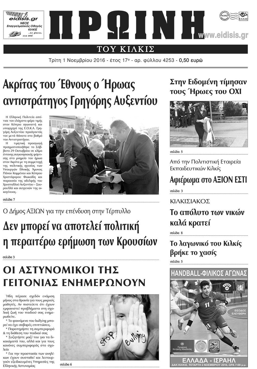 Πέντε χρόνια πριν. Διαβάστε τι έγραφε η καθημερινή εφημερίδα ΠΡΩΙΝΗ του Κιλκίς (1-11-2016)