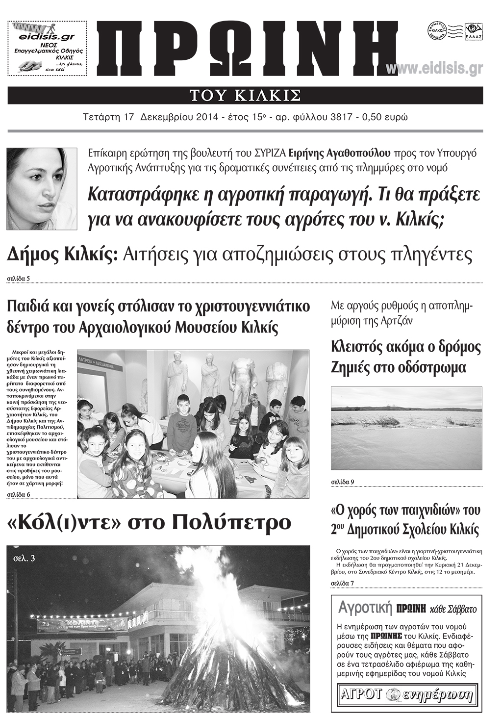 Πέντε χρόνια πριν. Διαβάστε τι έγραφε η καθημερινή εφημερίδα ΠΡΩΙΝΗ του Κιλκίς (17-12-2014)