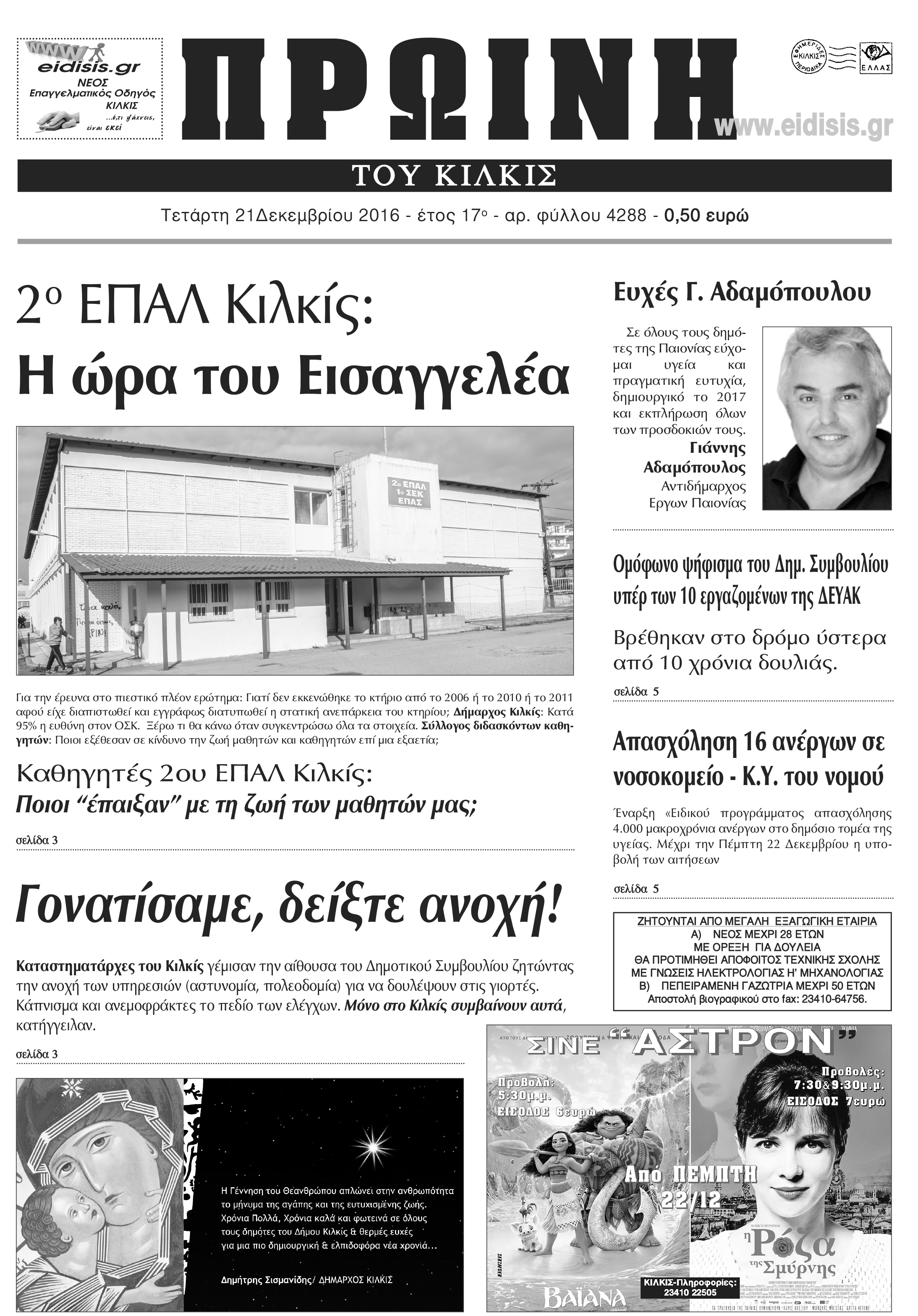 Πέντε χρόνια πριν. Διαβάστε τι έγραφε η καθημερινή εφημερίδα ΠΡΩΙΝΗ του Κιλκίς (21-12-2016)