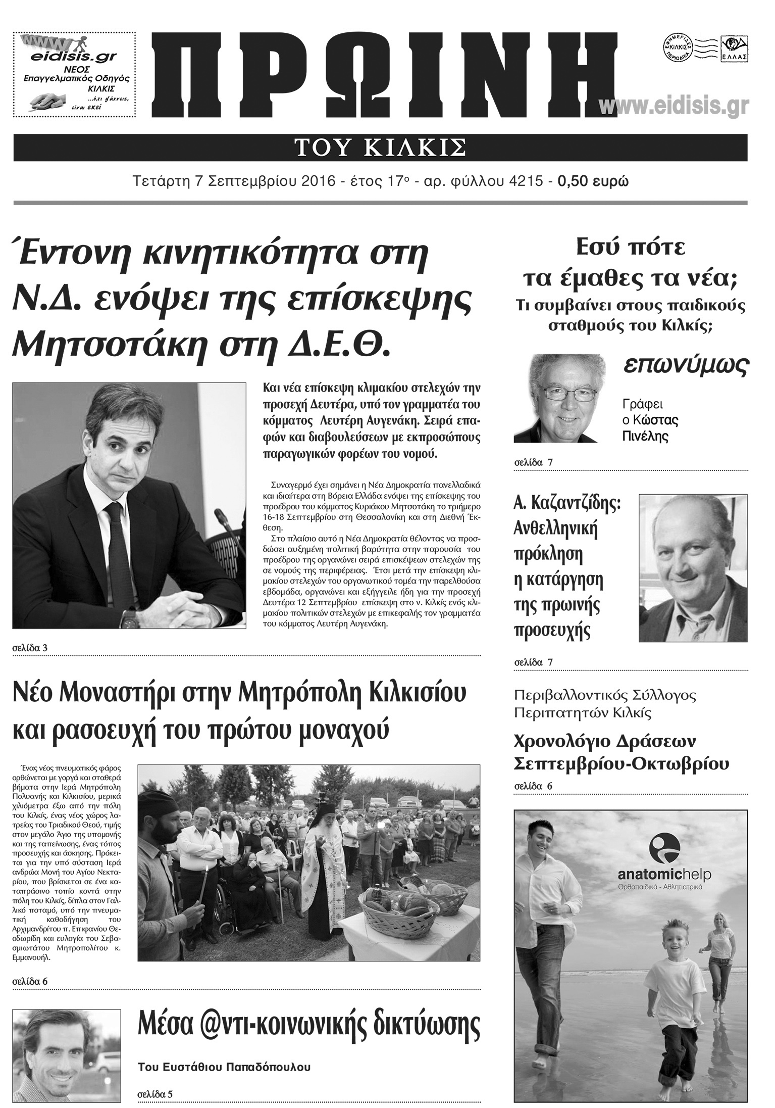 Πέντε χρόνια πριν. Διαβάστε τι έγραφε η καθημερινή εφημερίδα ΠΡΩΙΝΗ του Κιλκίς (7-9-2016)