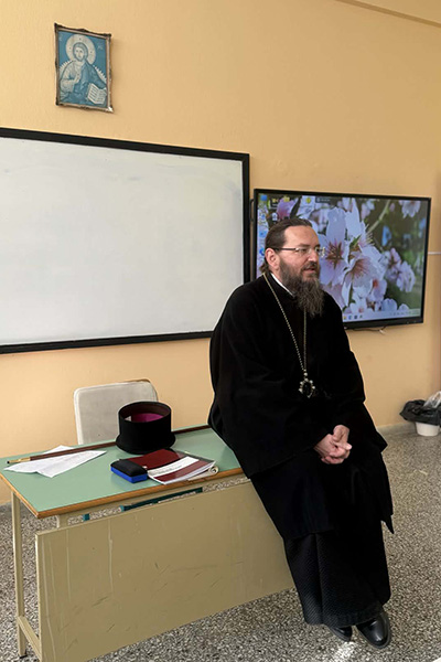 Ανταποκρινόμενος στην ευγενική πρόσκληση της Διευθύντριας του Σχολείου κας Χριστοδούλας Βογιαντζή και συνοδευόμενος από τον εφημέριο του Ιερού Ναού Αγίων Κωνσταντίνου και Ελένης Πρωτ. Νικόλαο Αντολίνεζ, ο Σεβασμιώτατος είχε μια εποικοδομητική συζήτηση με τους μαθητές του Λυκείου, με την ευκαιρία και της Αγίας και Μεγάλης Τεσσαρακοστής, απαντώντας σε ερωτήσεις τους, οι οποίες καθόρισαν τον διάλογο, δημιουργώντας ένα όμορφο κλίμα επικοινωνίας.