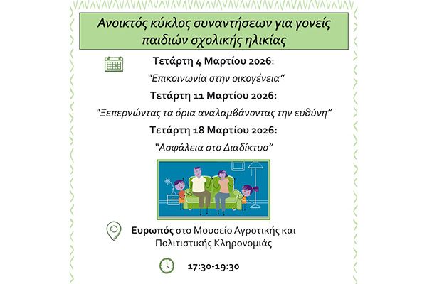 Οι συναντήσεις απευθύνονται σε γονείς/κηδεμόνες/φροντιστές που μεγαλώνουν παιδιά ηλικίας 6-11 χρονών. Στοχεύουν στην ενίσχυση τους στο γονεϊκό ρόλο και ειδικότερα στην ευαισθητοποίηση τους για το πώς η ύπαρξη οικογενειακών κανόνων, η οριοθέτηση και η ενεργητική ακρόαση συμβάλλουν στην ευημερία των παιδιών, αλλά και στο χτίσιμο μιας δυνατής σχέσης, ασφάλειας κι εμπιστοσύνης μεταξύ των μελών της οικογένειας. Συντονίστρια θα είναι η κα. Μαρία Χατζηγεωργιάδου, ψυχολόγος, στέλεχος πρόληψης. Οι συναντήσεις είναι δωρεάν και θα πραγματοποιούνται κάθε Τετάρτη στο Μουσείο Αγροτικής και Πολιτιστικής Κληρονομιάς και ώρες 17:30-19:30. Πιο συγκεκριμένα, την Τετάρτη: 4 Μαρτίου 2026 με θέμα “Επικοινωνία στην οικογένεια”, 11 Μαρτίου 2026 με θέμα “Ξεπερνώντας τα όρια, αναλαμβάνοντας την ευθύνη” και 18 Μαρτίου 2026 με θέμα “Ασφάλεια στο διαδίκτυο”.