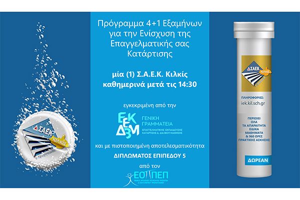 Η Δημόσια Σχολή Ανώτερης Επαγγελματικής Κατάρτισης (Σ.Α.Ε.Κ.) (πρώην Ι.Ε.Κ.) Κιλκίς απευθύνει πρόσκληση στους ενδιαφερόμενους για ΔΩΡΕΑΝ Επαγγελματική Κατάρτιση Πολίτες, στους Φορείς και τις Επιχειρήσεις του Νομού, ώστε να υποβάλουν τις Προτάσεις τους για την επιλογή Νέων Ειδικοτήτων Επαγγελματικής Κατάρτισης, που θα λειτουργήσουν από τον Οκτώβρη 2025 στη Σ.Α.Ε.Κ. Κιλκίς.