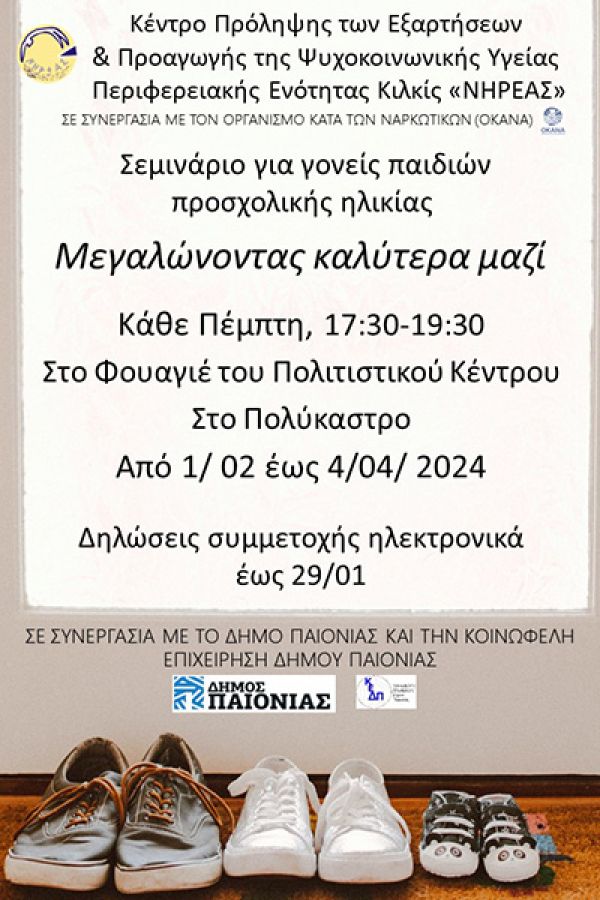 Οι συναντήσεις, συνολικής διάρκειας 20 ωρών, θα πραγματοποιούνται 1 φορά την εβδομάδα στο φουαγιέ του Πολιτιστικού Κέντρου στο Πολύκαστρο (Κ. Παλαιολόγου 3 στην κεντρική πλατεία) και συγκεκριμένα κάθε Πέμπτη, ώρες 17:30-19:30. Ξεκινούν στις 1 Φεβρουαρίου και ολοκληρώνονται στις 4 Απριλίου 2024. Το σεμινάριο είναι δωρεάν. Συντονίστρια είναι η κα Μαρία Χατζηγεωργιάδου, ψυχολόγος. Στους γονείς που θα συμμετέχουν θα δοθεί υποστηρικτικό υλικό.