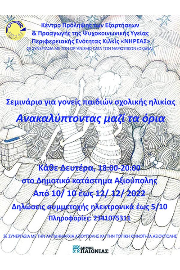 Το σεμινάριο βασίζεται στην βιωματική ομαδική εκπαίδευση και δίνει τη δυνατότητα στους γονείς: α) να αναγνωρίσουν τους τρόπους με τους οποίους οι δικές τους συμπεριφορές και το περιβάλλον μέσα στο οποίο μεγαλώνουν τα παιδιά τους επηρεάζουν την ανάπτυξη των τελευταίων, β) να μάθουν να χρησιμοποιούν κατάλληλες πρακτικές διαπαιδαγώγησης που αφορούν την πειθαρχία, οριοθέτηση, επίβλεψη και διαχείριση ενοχλητικών συμπεριφορών των παιδιών, γ) να αυξήσουν τη θετική αλληλεπίδραση με τα παιδιά τους και δ) να μάθουν να είναι υπεύθυνοι και να αποτελούν πρότυπο για τα παιδιά τους, επιδεικνύοντας θετική/σωστή συμπεριφορά και αξίες. Στους γονείς που θα συμμετέχουν θα δοθεί υποστηρικτικό υλικό. Τα σεμινάρια είναι δωρεάν. Συντονίστρια είναι η κα Μαρία Χατζηγεωργιάδου, ψυχολόγος, στέλεχος πρόληψης.