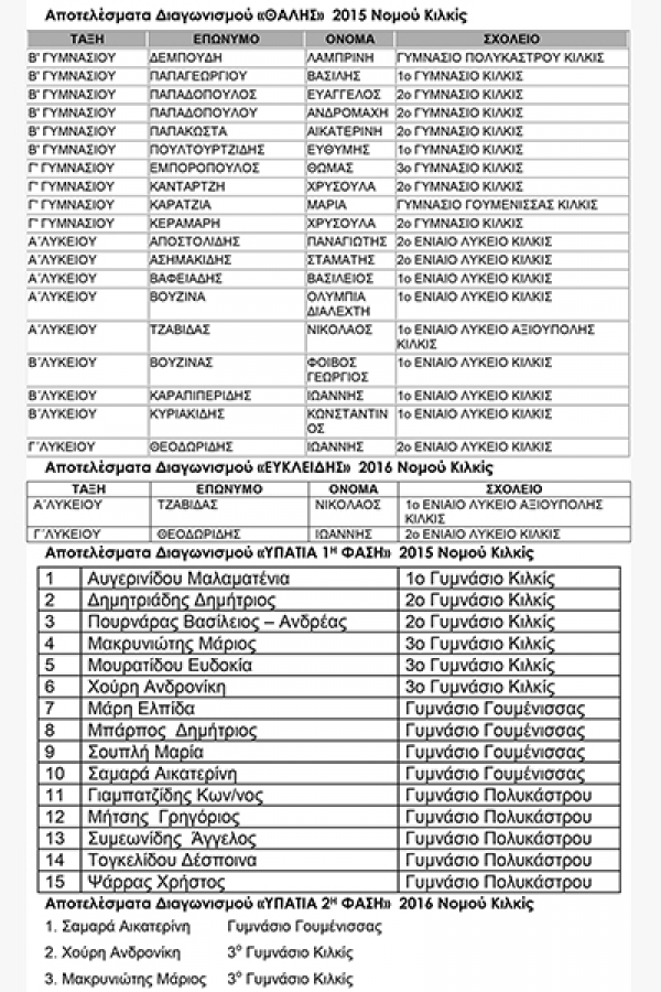 Οι μαθητές που διακρίθηκαν σε μαθηματικούς διαγωνισμούς καταγράφονται στον πίνακα που δημοσιεύουμε.