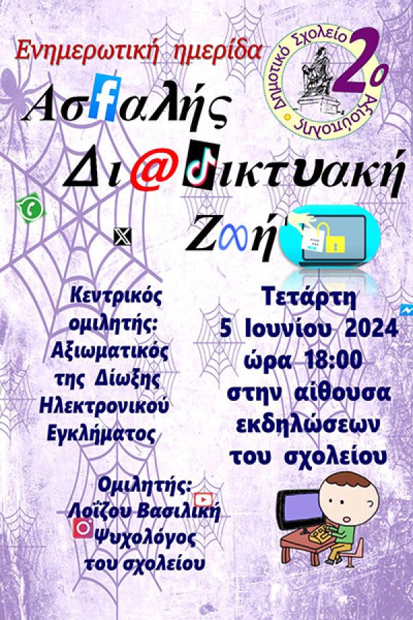 To 2ο Δημοτικό Σχολείο Αξιούπολης διοργανώνει εκπαιδευτική ημερίδα με τίτλο «Ασφαλής Διαδικτυακή Ζωή» την Τετάρτη 5 Ιουνίου 2024 και ώρα 6 το απόγευμα στην αίθουσα εκδηλώσεων του σχολείου με ομιλητές Αξιωματικό από τη Δίωξη Ηλεκτρονικού Εγκλήματος της Ελληνικής Αστυνομίας και την κ. Λοΐζου Βασιλική, Ψυχολόγο του σχολείου.