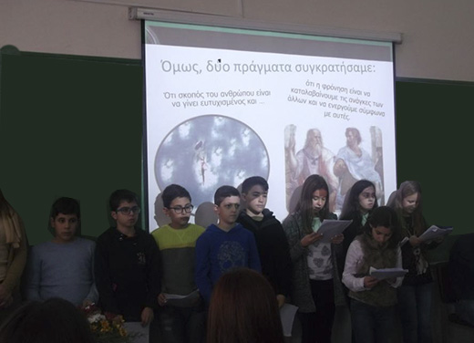 Η εργασία υλοποιήθηκε από το τμήμα Ε1 του Σχολείου, τη σχολική χρονιά 2015- 2016 με αφορμή το επετειακό έτος εορτασμού των 2400 χρόνων από τη γέννηση του οικουμενικού Μακεδόνα φιλοσόφου. Τα παιδιά στην εργασία τους, κατέγραψαν τις απόψεις τους για μια σειρά από ζητήματα που τα απασχολούν κατά τη διάρκεια της φοίτησής τους στο Σχολείο, αλλά και στη ζωή τους γενικότερα. Τα ζητήματα που πραγματεύτηκαν ήταν: η ευτυχία, τα πάθη, ο πλούτος, ο σεβασμός, η εξουσία, η δικαιοσύνη, η αρετή, η φρόνηση και πάνω απ’ όλα η φιλία. Μετά την καταγραφή των απόψεων που έγινε με τη βοήθεια ηλεκτρονικών ερωτηματολογίων, συνέκριναν τα πορίσματά τους με αυτά του Αριστοτέλη. Τα συμπεράσματά τους συζητήθηκαν στην τάξη προκειμένου να τους βοηθήσουν να βελτιώσουν την καθημερινότητά τους και τις διαπροσωπικές τους σχέσεις.