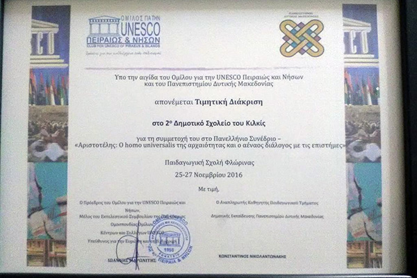 Το Σάββατο 26.11.2016, σε αίθουσα της Παιδαγωγικής Σχολής του Πανεπιστημίου Δυτικής Μακεδονίας στη Φλώρινα, παρουσιάστηκε με επιτυχία από τους μαθητές και τις μαθήτριες της Στ΄ Τάξης του 2ου Δημοτικού Σχολείου Κιλκίς η εργασία τους με θέμα: «Η οργάνωση της σχολικής ζωής με βάση τις απόψεις του Αριστοτέλη»,
