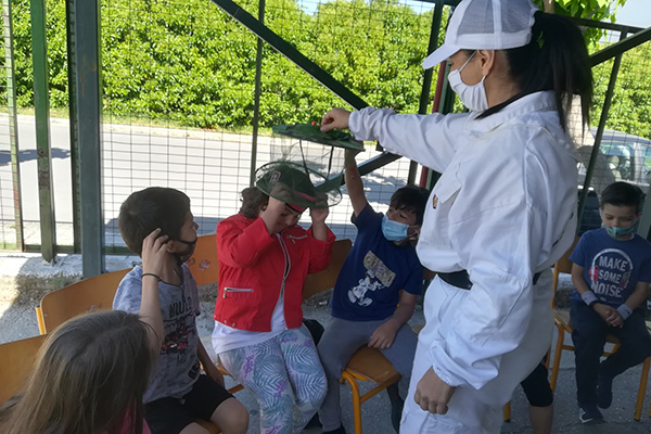 Μαζί της παρατήρησαν τις κυψέλες, τις κηρήθρες και όλο τον εξοπλισμό του μελισσοκόμου, έμαθαν τα στάδια παραγωγής του μελιού, της πρόπολης, του βασιλικού πολτού και του φυσικού κεριού.