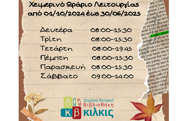 Η Δημόσια Κεντρική Βιβλιοθήκη του Κιλκίς αλλάζει το ωράριο λειτουργίας της Το εβδομαδιαίο πρόγραμμα λειτουργίας από 01/10/2024 έως και 30/06/2025 έχει ως εξής: