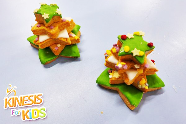 Επόμενος σταθμός; Η δημιουργία των χριστουγεννιάτικων μπισκοτόδεντρων, που μας υποσχέθηκε η κυρία Σάσα. Αφού φτιάξαμε, τα νόστιμα μπισκοτάκια μας σε σχήμα αστεριού, ξεκινήσαμε τη διακόσμηση. Με τη βοήθεια κόλλας ζαχαροπλαστικής, πασπαλίσαμε με χρωματιστές τρούφες και τοποθετήσαμε τη ζαχαρόπαστα στα αστεράκια που θέλαμε. Βάζοντας το ένα πάνω στο άλλο, δημιουργήσαμε ένα πανέμορφο και πεντανόστιμο δεντράκι. Ευχαριστούμε πολύ κυρία Σάσα γι’ αυτή τη δημιουργία, ήταν όλα υπέροχα.