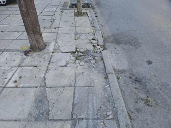 Πεζοδρόμια μέσα στις λακκούβες, κομμένα στα δύο,πεζοδρόμια άφαντα σε κάποιες πλευρές του δρόμου με τις εσοχές των κάδων και τα δέντρα να κάνουν την ζωή των ανθρώπωνδύσκολη με την ευθύνη του Δήμου.