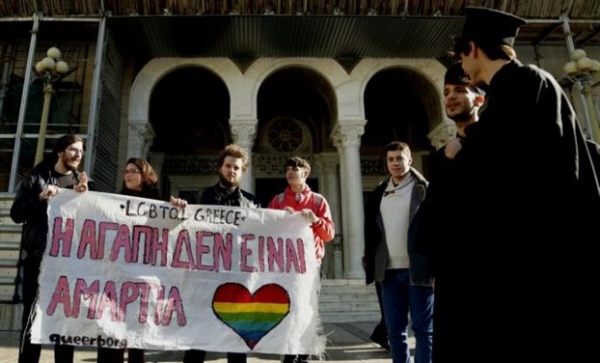 Τη διαμαρτυρία τους για τις δηλώσεις των μητροπολιτών Θεσσαλονίκης Ανθίμου, Καλαβρύτων Αμβροσίου, Πειραιώς Σεραφείμ και Μεσογαίας Νικολάου σχετικά με το σύμφωνο συμβίωσης των ομόφυλων ζευγαριών, εξέφρασαν το απόγευμα της Τρίτης, ενδεδυμένοι με ρούχα κληρικών, ομοφυλόφιλοι στον περίβολο της Μητρόπολης Αθηνών.