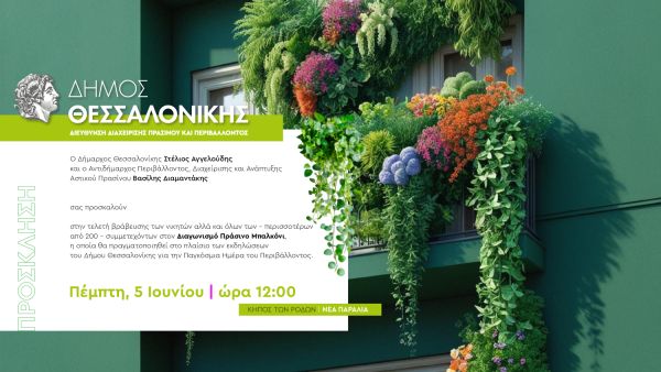 Ο Δήμαρχος Θεσσαλονίκης Στέλιος Αγγελούδης και ο Αντιδήμαρχος Περιβάλλοντος, Διαχείρισης και Ανάπτυξης Αστικού Πρασίνου Βασίλης Διαμαντάκης σας προσκαλούν στην τελετή βράβευσης των νικητών στο διαγωνισμό «Πράσινο μπαλκόνι» που θα πραγματοποιηθεί στο πλαίσιο των εκδηλώσεων του Δήμου Θεσσαλονίκης για την Παγκόσμια Ημέρα Περιβάλλοντος την Πέμπτη 5 Ιουνίου στις 12 το μεσημέρι, στον Κήπο των Ρόδων (Νέα Παραλία).