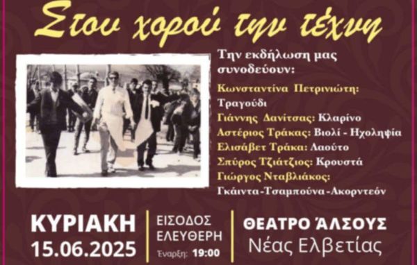 Κυριακή 15 Ιουνίου και ώρα 19:00 στο θέατρο άλσους της Νέας Ελβετίας – Η είσοδος θα είναι ελεύθερη.