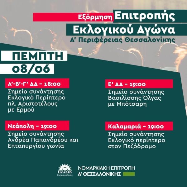 Η Νομαρχική Επιτροπή Α΄ Θεσσαλονίκης του ΠΑΣΟΚ-ΚΙΝΑΛ πραγματοποιεί σήμερα Πέμπτη (08/06) εξόρμηση εκλογικού αγώνα στην περιφέρεια της Α΄ Θεσσαλονίκης.