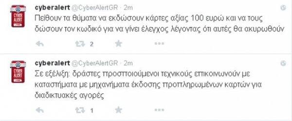 Και στη συνέχεια: «Πείθουν τα θύματα να εκδώσουν κάρτες αξίας 100 ευρώ και να τους δώσουν τον κωδικό για να γίνει έλεγχος λέγοντας ότι αυτές θα ακυρωθούν».