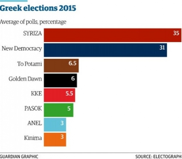 Σύμφωνα με τις εκτιμήσεις του Guardian η πτώση των δύο κομμάτων της συγκυβέρνησης θα είναι αισθητή σε αυτές τις εκλογές. Το ΠαΣοΚ έχει χάσει πλέον το μεγαλύτερο μέρος της δυναμικής του, έτσι όπως αυτή χτίστηκε το 1980 και εντεύθεν, σε αντίθεση με τον ΣΥΡΙΖΑ που είδε το 17% του 2012 να ανεβαίνει στο 27% τους επόμενους μήνες και τώρα να βρίσκεται σταθερά μπροστά.