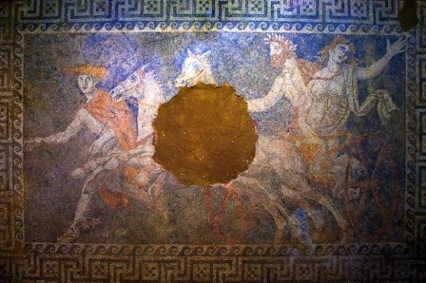 Στο ψηφιδωτό της Αμφίπολης η απόδοση της προοπτικής και της τρίτης διάστασης είναι ιδιαίτερα εμφανής στις μορφές του Ερμή και της Περσεφόνης, «καθώς αυτές κινούνται με ορμή και αντιθετικά. Η προοπτική αυτή απεικόνιση επιτυγχάνεται με τις διάφορες συνιζήσεις των σωμάτων, τις αλληλοκαλύψεις τους, τις ελαφρές φωτοσκιάσεις, την αλλαγή των χρωματικών τόνων».