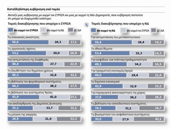 Ιδιαίτερη σημασία έχουν οι απαντήσεις που έδωσαν οι πολίτες για την καταλληλότερη κυβέρνηση ανά τομέα. Συγκεκριμένα, μια κυβέρνηση με κορμό το ΣΥΡΙΖΑ, μπορεί να διαχειρισθεί καλύτερα, τις κοινωνικές ανισότητες (56,6%), τις εργασιακές σχέσεις (53,1%), την αντιμετώπιση της διαφθοράς (49,4%), την διευθέτηση του χρέους (45,3%), τη βελτίωση του φορολογικού συστήματος (44,3%), τη βελτίωση του συστήματος υγείας (43,9%), την αναδιάρθρωση της δημόσιας διοίκησης (35,2%) και τη μείωση της ανεργίας (34,9%). Βέβαια, μια κυβέρνηση με κορμό τη Ν.Δ. έχει τις τρεις καλύτερες επιδόσεις στα προαναφερθέντα πεδία, στη βελτίωση του συστήματος υγείας (41%), τη βελτίωση του φορολογικού συστήματος (38,2%) και την αναδιάρθρωση της δημόσιας διοίκησης (33,7%).