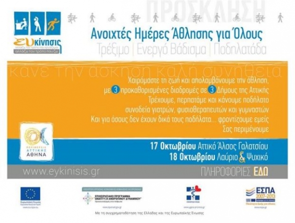 Ακριβώς το ίδιο πρόγραμμα και στις ίδιες ώρες ισχύει και για τους δυο δήμους, Ψυχικού και Λαυρίου, που θα φιλοξενήσουν το πρόγραμμα ΕΥ-ΚΙΝΗΣΙΣ την Κυριακή. Η Ανοιχτή Ημέρα Άθλησης διεξάγεται με ελεύθερη συμμετοχή και κανένα κόστος για τους συμμετέχοντες.