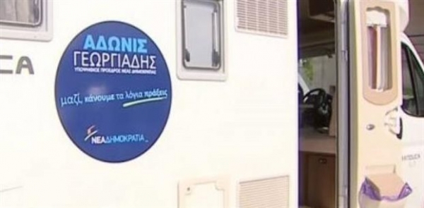 Ο κ. Γεωργιάδης περιοδεύει στο νομό Χαλκιδικής με αυτοκινούμενο τροχόσπιτο, συνοδευόμενος από τη σύζυγό του Ευγενία Μανωλίδου.