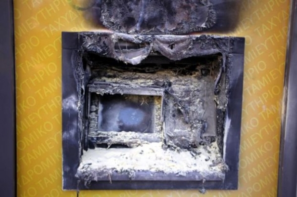 Ύστερα από δυο λεπτά, πυρκαγιά προκλήθηκε από την ενεργοποίηση αυτοσχέδιου εκρηκτικού μηχανισμού σε δυο ΑΤΜ στην οδό Κερκύρας 54 στο κέντρο της Αθήνας.