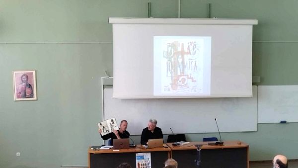 Την εκδήλωση χαιρέτισε επίσης ο Κοσμήτορας της Θεολογικής Σχολής, ο οποίος αναφέρθηκε στη συνεργασία με την Αγιορειτική Εστία που υπάρχει από το παρελθόν, αλλά αυτήν τη φορά αποκτά έναν εικαστικό χαρακτήρα και φέρνει στη Θεσσαλονίκη την Αγιορειτική ατμόσφαιρα.