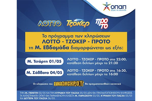 Οι κληρώσεις των ΤΖΟΚΕΡ και ΠΡΟΤΟ θα επανέλθουν στο κανονικό τους πρόγραμμα από την Τρίτη, 7 Μαΐου.
