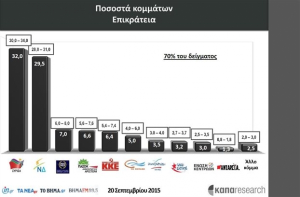 Σύμφωνα με το exit poll της Κάπα Research για το in.gr, tovima.gr, tanea.gr και τον ραδιοφωνικό σταθμό BHMA FM 99,5 η δύναμη των κομμάτων, στο 70% της ανάλυσης των στοιχείων, έχει ως εξής: