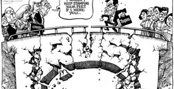 Στο σχετικό σκίτσο απεικονίζονται στις 2 πλευρές μίας γέφυρας, από τη μία οι δανειστές της χώρας και από την άλλη ο πρωθυπουργός της Ελλάδας με τον ελληνικό λαό.
