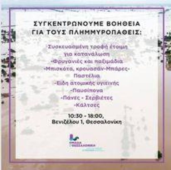 Εθελοντισμού η «Ομάδα για τη Θεσσαλονίκη» αναλαμβάνει την πρωτοβουλία να βρεθεί έμπρακτα στο πλευρό των συνανθρώπων μας που δοκιμάζονται στη Θεσσαλία με τη συγκέντρωση ειδών πρώτης ανάγκης.