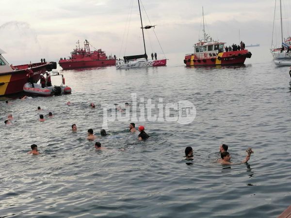 Την ώρα της τελετής, καραβάκια σφύριζαν, ενώ η μπάντα του δήμου έδινε το ρυθμό. Τον Σταυρό έπιασε ο Στέργιος Παναγιωτίδης.